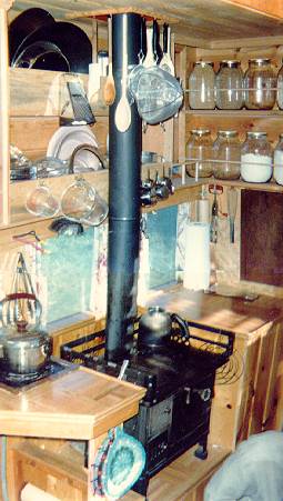 Above, Kitchen includes matching recycled quart and pint jars. French tempered glass service for eight. A food processor is the only 110 volt appliance. The 5 gallon jug is the only water supply for the kitchen. Another pressurized water system serves the toilet and shower only. Right, Ship's stove, a type no longer made. He can't say enough good about it. Under cabinet area to the left is wood storage. A one-burner propane hot plate is installed for fast jobs. |