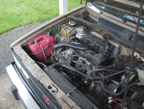 Yes, that's a one-and-a-quarter-gallon gas can under the hood. I connected the suction line from the injection pump to a dip tube in the gas can and put the return line in as well. Now the car runs and drives without pissing fuel all over the road and itself.