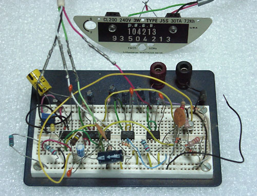 Here's the prototyping breadboard of the circuit. It never got much beyond this stage. In the rear is the panel from the watthour meter with the two optical sensors installed: