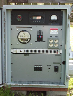 The cabinet has 19" rack rails, which made mounting the various components easy, and allows the system to be changed without having to tear things too far apart, new rack panels can be fabricated and mounted in place of those in the photo if and when the existing equipment is replaced or updated. All of the rack panel equipment is wired using multi-conductor connectors that makes it possible to remove each piece of equipment without altering the wiring. This makes it easy to access the interior of the cabinet for service, in some cases, panels can be removed without even having to power down the cabinet. For instance, the AC rack panel with the kilowatt hour meter and circuit breakers is completely enclosed on the backside so that there is no possibility of shock hazard, and the wiring harnesses have been constructed with adequate length cables to allow the panel to be placed on the ground while the system continues to operate normally. The top panel with the displays can be disconnected and completely removed without affecting the system's operation.